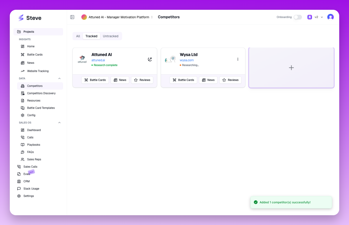After adding competitors, Steve automatically researches each one to gather pricing, features, positioning, and market data. Research happens in the background and typically completes within a few minutes.