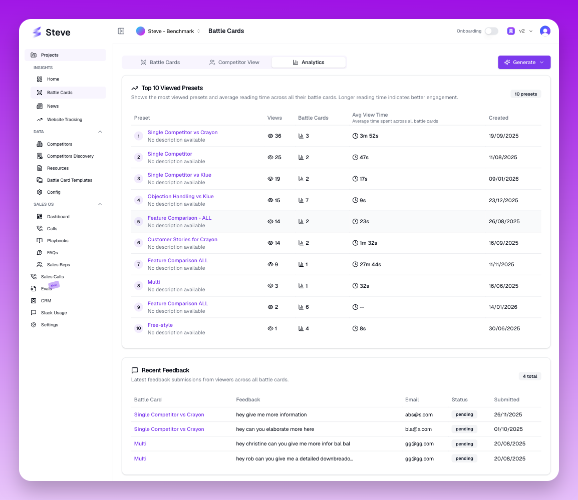 Analytics show how your team engages with battle cards. Track views, time spent, and sharing patterns to understand which competitive intelligence is most valuable.