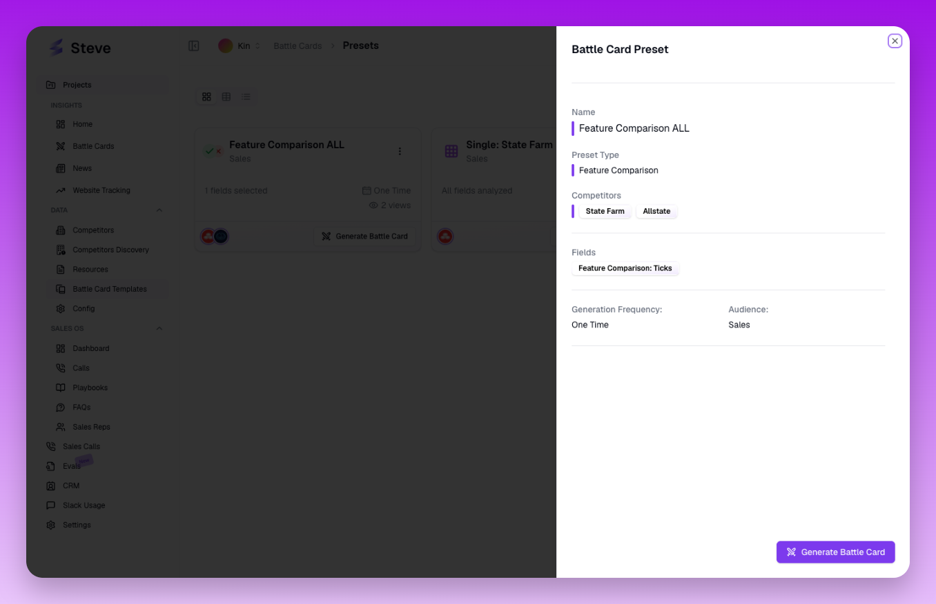 Use saved presets to generate battle cards faster. Presets apply predefined sections and formatting automatically, ensuring consistency across all your competitive content.
