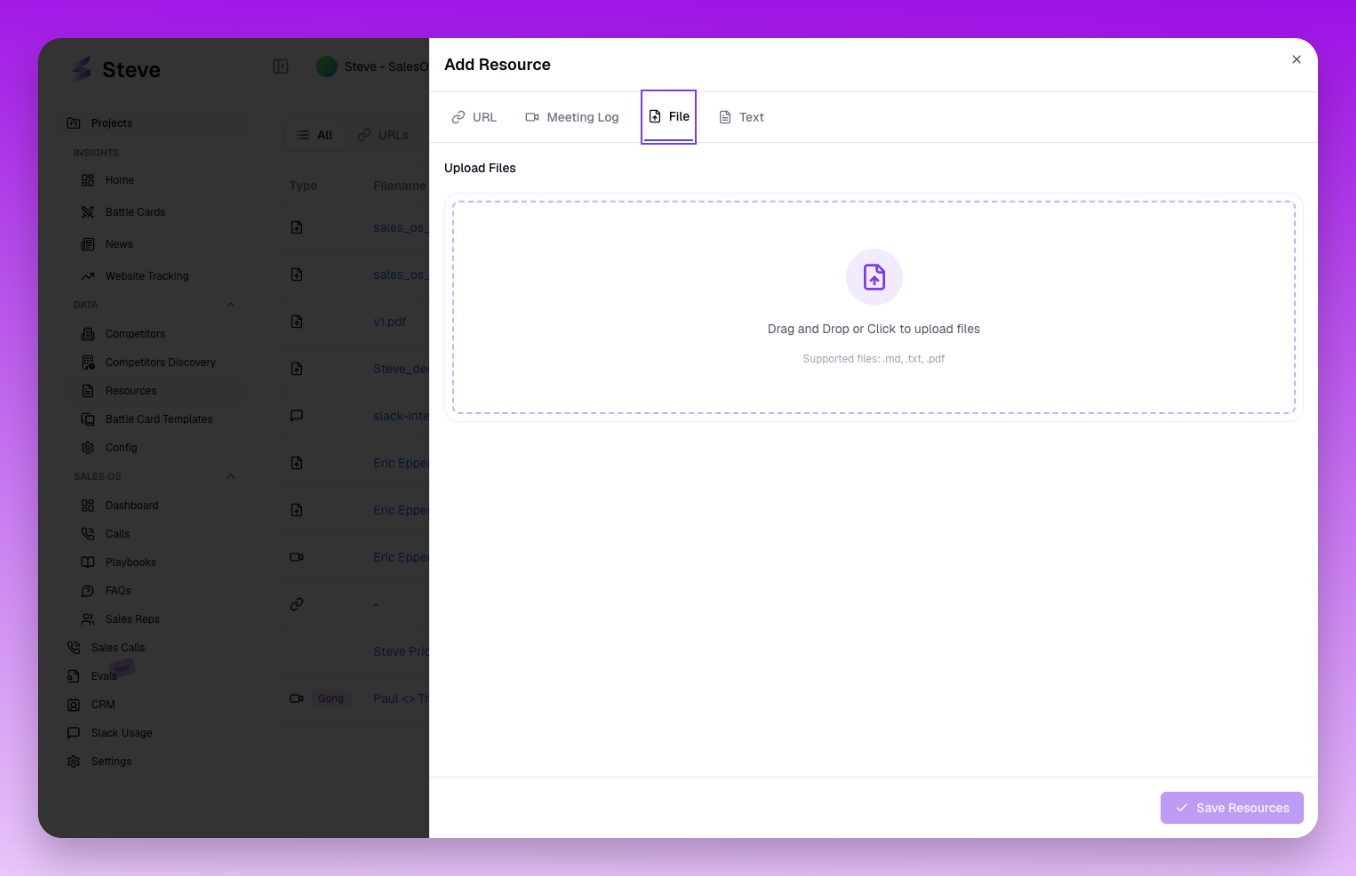 Upload internal materials like sales decks, product documentation, case studies, and call transcripts. Steve uses these resources to generate more accurate and personalized battle cards.